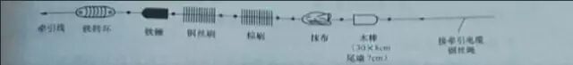 穿管器或者竹片从管道内穿出时,必须在末端绑上4.0铁线1根,带入管孔作为引线。在施工中,上一个施工人必须为下一个施工人预留引线。引线末端连接一套工具,包括铁转环、铁锤、钢丝刷、抹布、木棒等。可以有效清除管孔内淤泥和杂物同时清除积水。