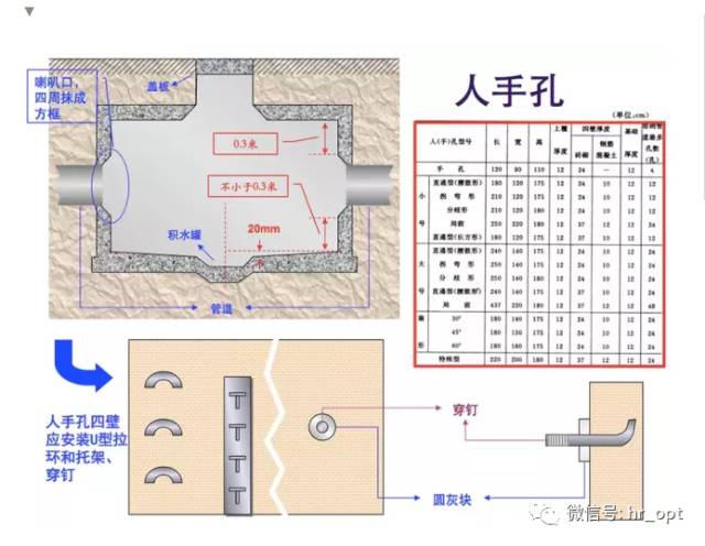 1、人手孔上覆至口圈,要用M10水泥砂浆砖砌不小于200mm,不大于 800mm的口腔,口腔与上覆口应该是同心圆。口腔内部应该抹灰并且连接处坚固,抹八字。