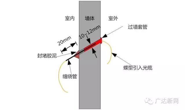 > 入户暗管不可利用或者无暗管的楼栋时:通过在楼内布放 PVC 线管方式敷设蝶形光缆,尽量选择垂直布放,避免横向交叉错位。