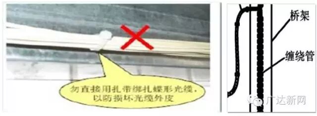 > 光纤敷设中应该严格注意光纤拉伸度和弯曲半径,避免缠绕、扭曲、踩踏造成对光纤的损伤。