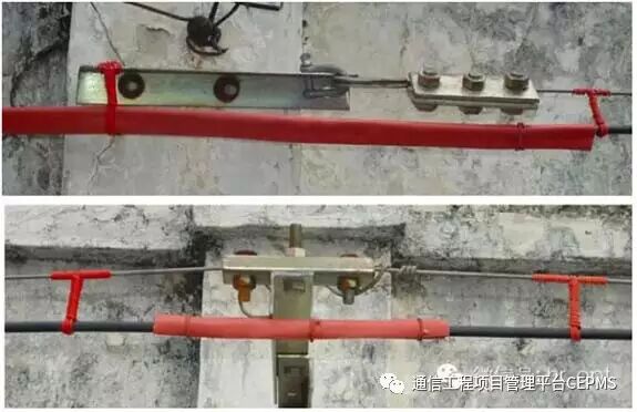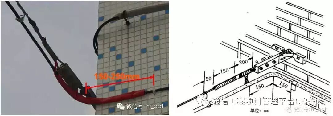 4、水平敷设的吊线在墙壁上的终端固定、中间支撑应符合上面两图的要求。