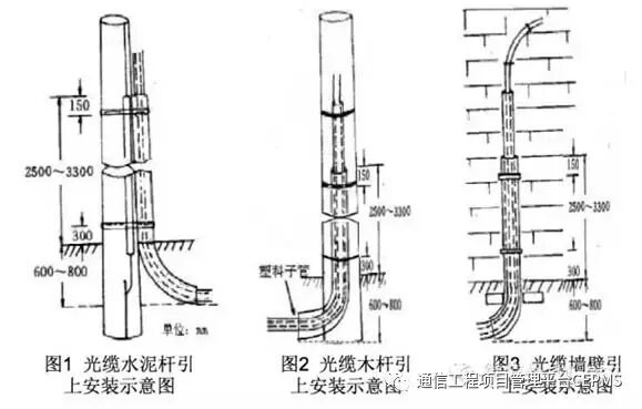 引上保护管的材质、规格、安装地点应符合设计要求。引上保护管在水泥杆、木杆和墙壁的绑扎固定方式应满足图1、2、3 的要求。