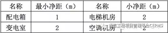 1、表楼道缆线与配电箱、变电室、电梯机房、空调机房之间最小净距符合下表的规定。