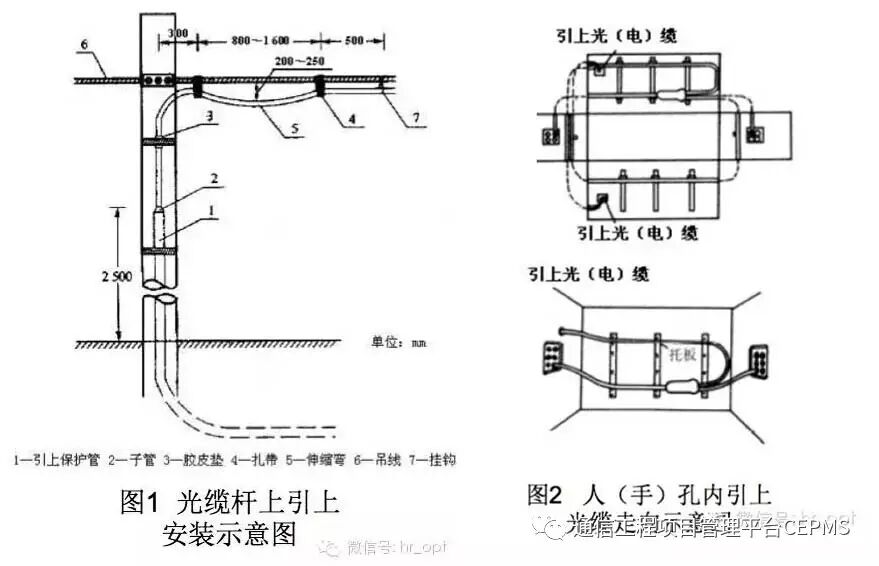 光缆在引上保护管上部的安装方式应符合 图1 的要求。(下图)在人(手)孔内的引上光缆的走向应符合 图2 的要求。