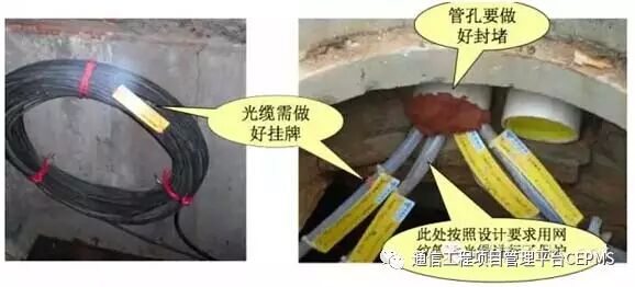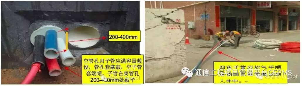 3、子管在人(手)孔内伸出长度一般为200~400mm;本期工程不用的管孔及子管管孔应及时按照设计要求进行封堵。