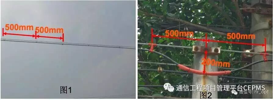在电杆两侧的第一只挂钩应各距电杆500mm,允许偏差±20mm,布放吊挂式架空光缆应在每1~3 根杆上作一处伸缩预留。伸缩预留在电杆两侧的扎带间下垂200mm。伸缩预留安装方式应符合图2的要求。光缆经十字吊线或丁字吊线处亦应安装保护管。架空光缆在吊线接头处的吊扎方式应符合图3的要求。