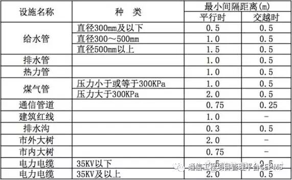 3、直埋光缆与其他设施平行或交越时,其间距不得小于上表的规定。