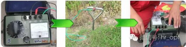基本原理是采用三点式电压落差法。测量手段是在被测地线接地桩(暂称为X)一侧地上打入两根辅助测试桩,要求这两根测试桩位于被测地桩的同一侧,三者基本在一条直线上,距被测地桩较近的一根辅助测试桩(称为Y)距离被测地桩20 米左右,距被测地桩较远的一根辅助测试桩(称为Z)距离被测地桩40米左右。测试时,按要求的转速转动摇把,测试仪通过内部磁电机产生电能,在被测地桩X和较远的辅助测试桩(称为Z)之间“灌入”电流,此时在被测地桩X和辅助地桩Y之间可获得一电压,仪表通过测量该电流和电压值,即可计算出被测接地桩的地阻。