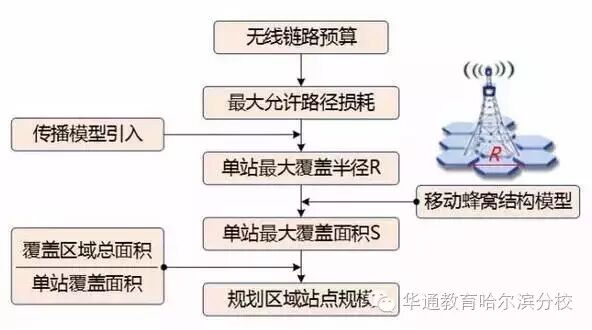 结合链路预算分析结果和典型区域传播模型,可以计算出在一定解调门限条件下无线信号的最大允许路径损耗,进而获得不同区域的单站最大覆盖半径,结合移动蜂窝结构模型,最终可以得出单站的最大覆盖面积。结合覆盖区域挖掘中获得的价值覆盖区域的面积,可以粗略估算出规划区域站点的总体规模,从而完成无线网预规划的预期目标。具体流程如下图所示: