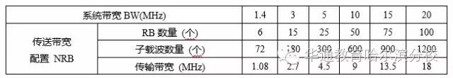 (3)可分配给用户的RB数和子载波数量:在系统带宽下,可分配给用户的RB数、子载波数量以及传输带宽配置如下表所示: