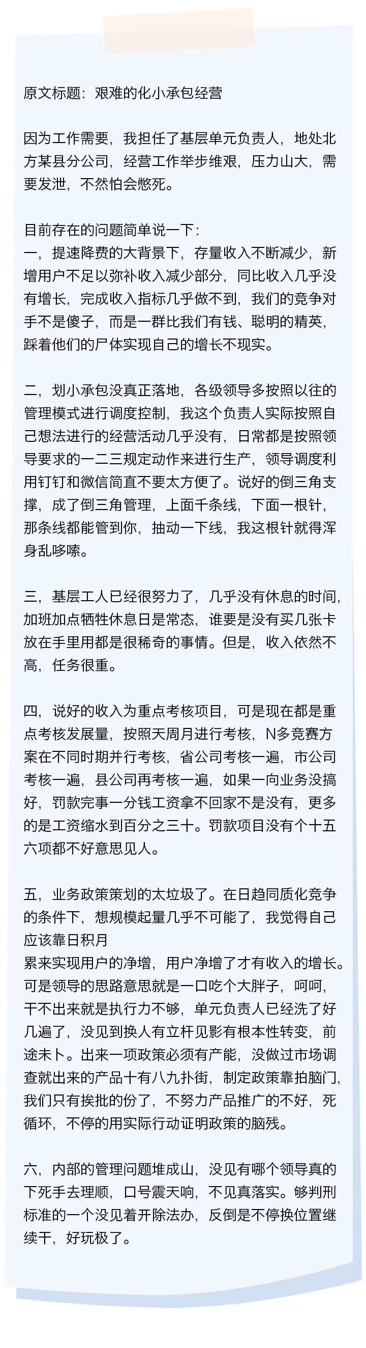 现在运营商的业务:工程建设、市场销售、网络运维,包括运营商的合作单位,比如代维、工程施工单位,很多都在尝试小微承包机制。运营商和上游企业掌握着规则,小微/承包人不仅承担指标考核,还要维系关系、处理垫资/收款、业务管理等各类问题。小微的经营越来越有挑战性,如何在当下环境中尽可能发挥、创新、发展,值得每一个小微/承包人思考。