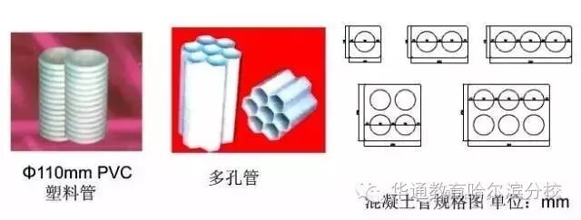 市话管道中,原来多用混凝土管;现在一般路段选用Φ110mm PVC 塑料管(壁厚3.5mm) 或多孔管;当在桥上架设或穿越河沟、涵洞以及过街道时PVC 管外加的保护管为Φ125mm 热镀锌钢管(壁厚3.5mm)。