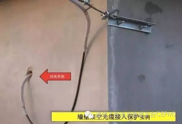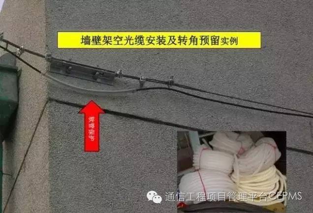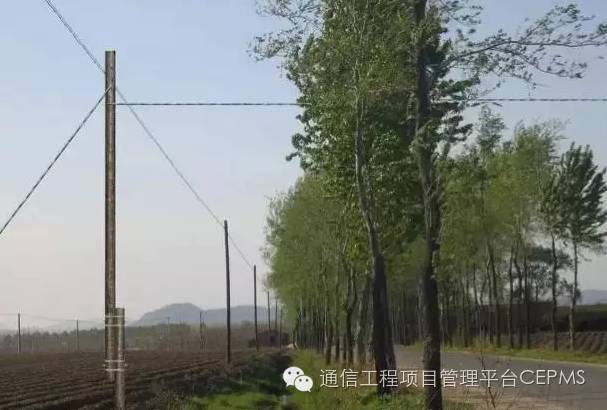 对架空光缆,若光缆紧靠树木等物体,有可能磨损时,在光缆与其他物体接触的部分,应用PVC 管进行保护。如靠近房屋应用防火漆进行保护。在与电力线交叉的情况下,应做好绝缘处理。