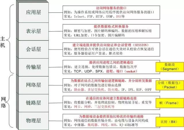 模型把网络通信的工作分为7层。1至4层被认为是低层,这些层与数据移动密切相关。5至7层是高层,包含应用程序级的数据。每一层负责一项具体的工作,然后把数据传送到下一层。由低到高具体分为:物理层、数据链路层、网络层、传输层、会话层、表示层和应用层。