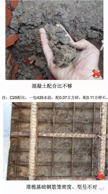 (6)地基基础开挖深度不够,地圈梁钢筋密度、型号与设计不符,混凝土配合比不符合设计要求,可能导致地基沉降。