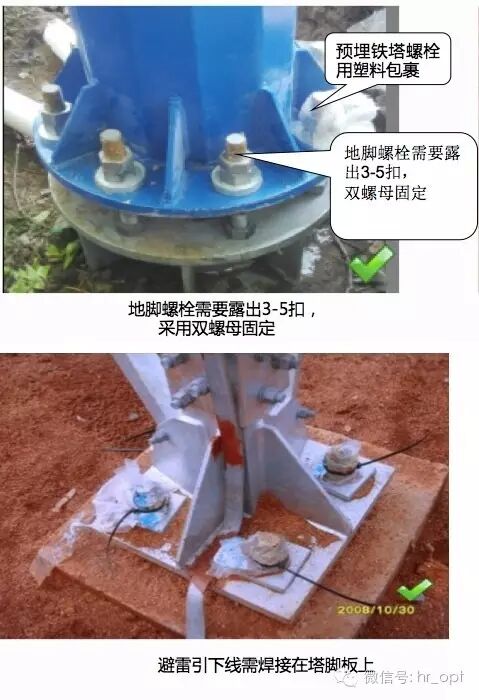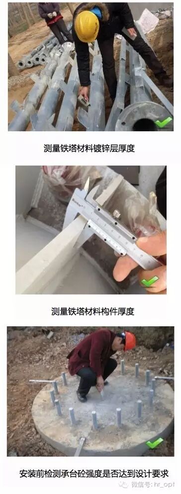 (2)基础验收、混凝土基础强度回弹仪测试:安装前对基础混凝土强度进行回弹测试,三管塔、角钢塔和三管塔砼不低于设计强度等级的70%,单管塔砼不低于设计强度等级的100%,方可组塔。
