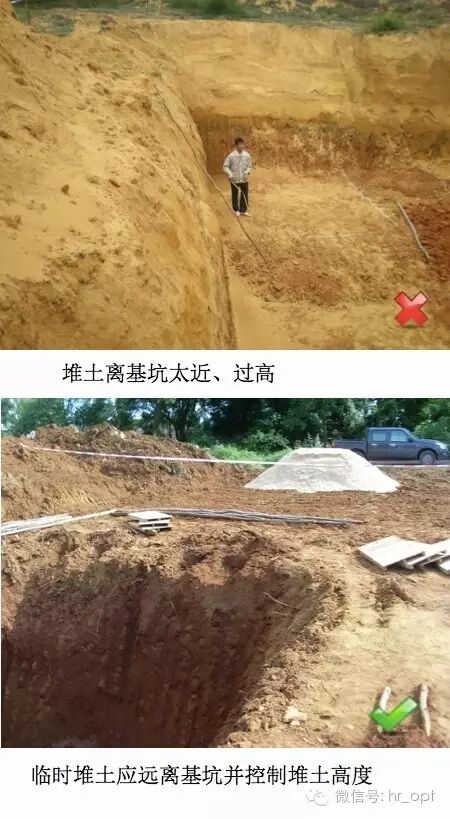 (3)基坑边缘堆土过近、过高,造成基坑坍塌事故。临时堆土距坑槽边沿至少1M,堆土高度不得超过1.5M。