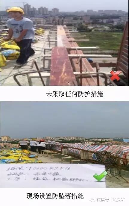 (9)楼顶女儿墙或山墙边新建反梁,没做好安全防护措施,存在高处坠落风险。现场需设置或搭设悬挑式脚手架、张开密目式安全网等防护措施,以防人员、工器具坠落。