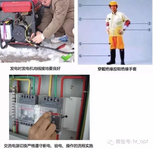 (8)雨雪天发电时,应穿戴绝缘胶鞋、绝缘手套避免电缆漏电而被伤害。
