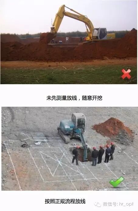 (1)放样人员未按设计图纸定位放样,造成基础位置偏移,存在持力层土质改变,地基承载力不符合设计要求的风险。应根据轴线控制桩投测出控制轴线,然后根据开挖线与控制轴线的尺寸关系放样出开挖线,并撒白灰线作为标志。
