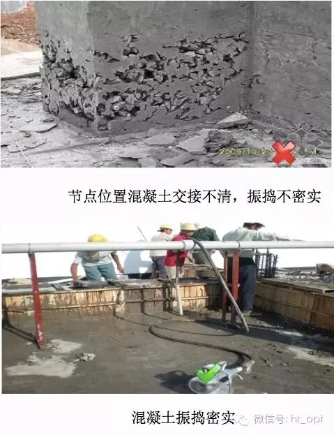 (14)现浇混凝土搅拌不均匀,振捣不密实,造成混凝土强度不够,存在安全隐患;现场拌制混凝必须搅拌均匀,搅拌时间不得少于5分钟,浇筑时必须用振动棒振捣密实,振动棒快插慢拔,振动棒插入后混凝土面不冒气泡不下沉即表示混凝土振捣密实,同时梁柱节点位置钢筋密集,必须加强振捣。