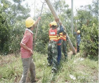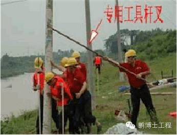 | 图2 立杆时,杆头下方人员要有挡板把杆头导入杆洞里面,中间几个人水泥杆的两边用撑杆把水泥杆慢慢支撑起来 | ||||