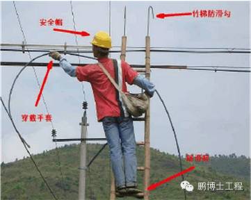 | 图4 上杆作业注意头顶电力线做好防范措施,作业人员、金属材料不得高于杆梢 | |||||