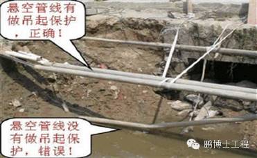 图4 挖出地下管线并悬空时,在进行适当的包托后应与沟坑顶面上能承重的横梁用铁线吊起以防沉落。 | ||||
