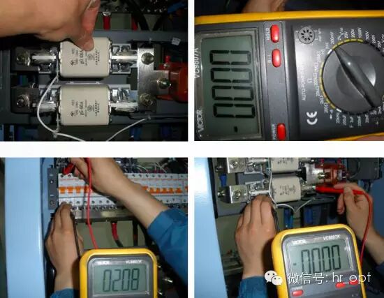 使用万用表直流档进行测量,正负极分别接在熔断器上端与下端,万用表显示值即为压降电压。要求压降每百安培≤5mV,不符合要求的熔断器予以更换并检查接触点。
