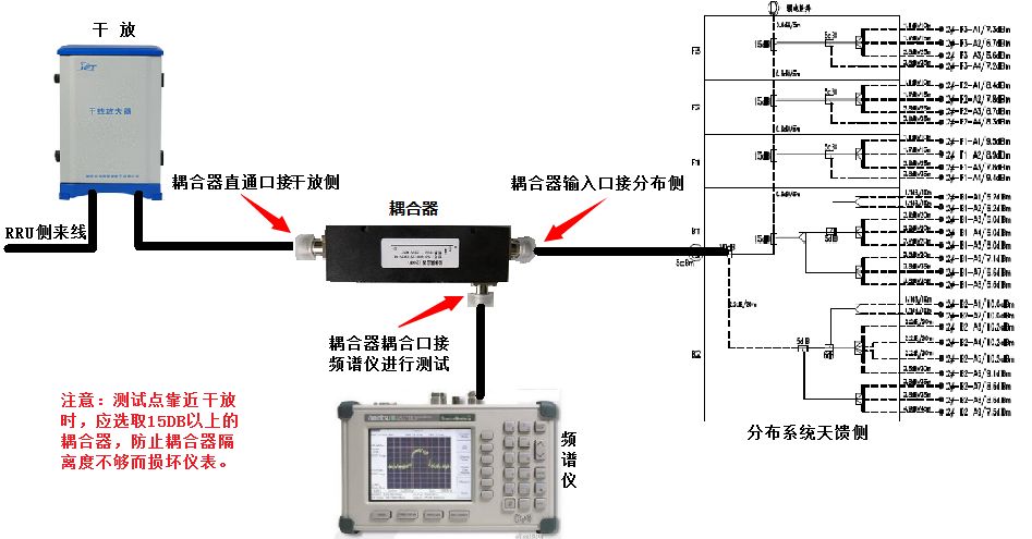 •底噪过高:这类问题应由基站侧向天馈侧排查,逐步缩小范围,定位干扰源。排查时可以分别断开各个支路,对比底噪有无明显下降,向下逐级排查;如使用频谱仪测试时,应使用耦合器馈入办法,将耦合器按上行信号方向接入分布,上行信号通过耦合器进口由直通口到达基站方向,将频谱仪接在耦合器耦合口进行测试对比。