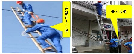 梯子上不准有两人同时上下和作业,严禁垫高使用和作业人员站在梯子上移动梯子。不得使用木制或简易的梯子,梯底不稳及打滑的梯子禁止使用。梯子不用时,应随时放倒,不准放在露天任其日晒雨淋,以防损坏后期使用发生危险。