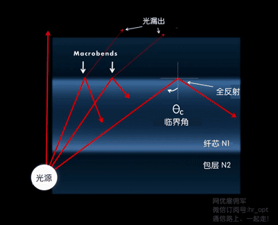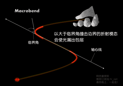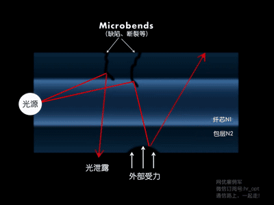 两种弯曲都会发生光损耗:Macrobend(宏弯) 和Microbend(微弯)。
