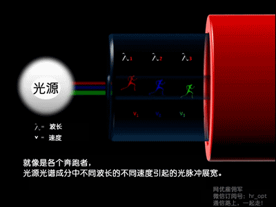 光纤材料石英玻璃的折射率对不同的传输光波长有不同的值,许多不同波长的太阳光通过棱镜以后可分成七种不同颜色就是一个证明。由于上述原因,材料折射率随光波长而变化从而引起脉冲展宽的现象称为材料色散。