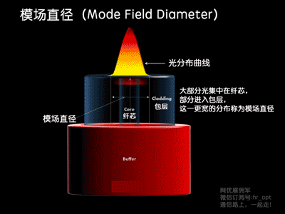 大部分光集中在纤芯,部分进入包层,这一更宽的分布称为模场直径。