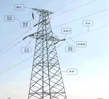 架空输电线路的主要部件有: 导线和地线(含OPGW)、杆塔、绝缘子、金具、杆塔基础、拉线和接地装置等组成,如下图: