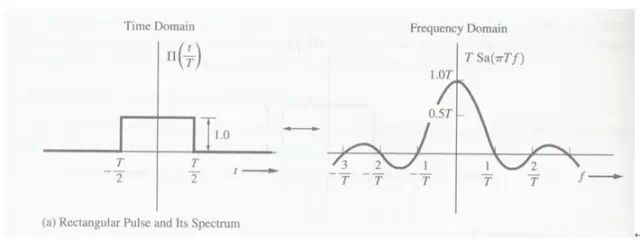 由上图我们可以注意到,一个持续时间为T的方波,它的频谱是一个SINC函数,零点带宽是1/T,即时间的倒数。当然,方波的带宽是无限大的,因此这样的波形在现实中是很难实现的,我们只能给方波提供一定的带宽,就是说得到的肯定只能是经过了过滤的波形。