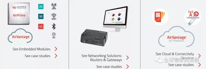配合通信模块,Sierra Wireless 推出一系列智能路由器和网关以及管理工具和应用程序,根据客户具体要求提供蜂窝连接服务,同时所有蜂窝网关都可以通过AirVantage Cloud平台进行远程监控,管理和控制。