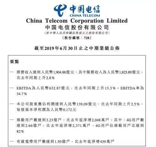 中国电信上半年营收入1,904.88亿元 净利润139亿元 4G用户数达到2.66亿
