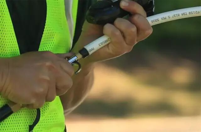现在讲讲那些液体,那是可生物降解液。通过福特F350上的压缩机,高压将可生物降解液压入同轴电缆,这些降解液可压缩泡沫聚乙烯层,使之从铝箔层脱离。然后,抽出内导体层和绝缘层就可以了。