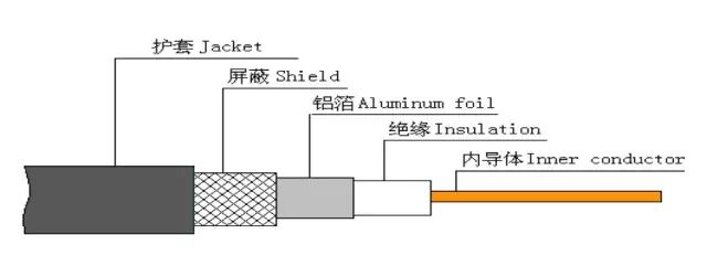 同轴电缆内有:内导体铜芯、绝缘层(通常是泡沫聚乙烯)、铝箔层、屏蔽层和护套。