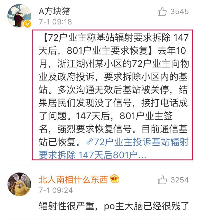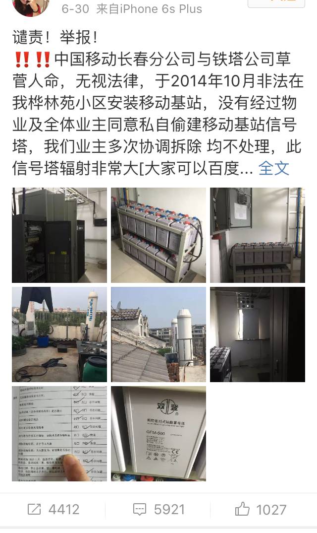 一位网友发文谴责称,中国移动和铁塔公司草菅人命,无视法律,非法安装移动基站,由于辐射非常大[大家可以百度搜索],其所在小区很多邻居发生了不适症状、孕妇都不敢在家里居住,失眠,头痛,恶心,还可能致癌、白血病等,危害很大!!