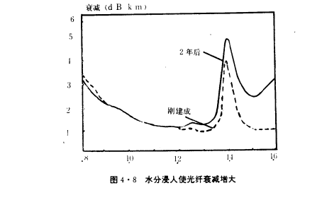 实验表明,水分长期沒入光缆会使光纤哀减增大,尤其在1.55pm波长上,如图所示: