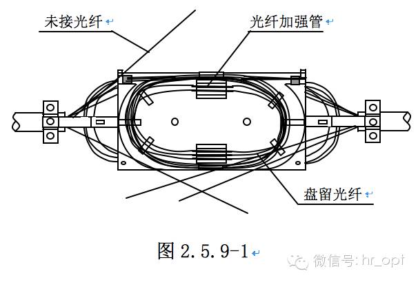 2.5.9-1完成光纤接续后,应把光纤余长在盘留板内进行盘留。盘留时应将A、B两侧光纤同时压花盘留,盘留圈数控制为偶数,以达到相互抵消扭力的作用。最后将光纤接头保护管按顺序放入固定槽内。见图2..5.9-1。