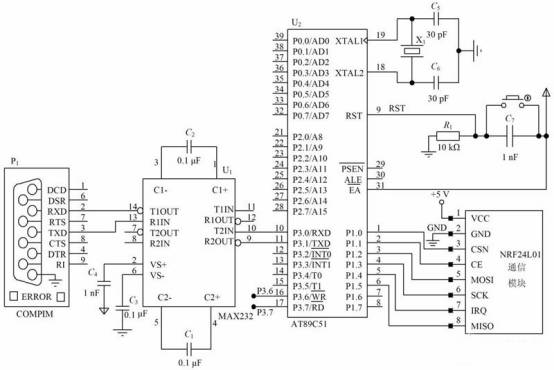在图4 所示的电路中, 单片机左侧是一块MAX232芯片, 其作用是将PC 机中的232 电平与单片机的T TL 电平匹配。最左侧是9 芯母接头,在使用时可接在计算机COM 口上与计算机通信。单片机右侧接一块射频通信模块。由于此块单片机同样没有SPI 接口,所以需要用普通接口软件模拟SPI 接口,其编程要严格按SPI 端口的通信逻辑时序。