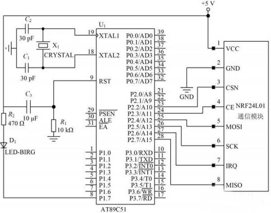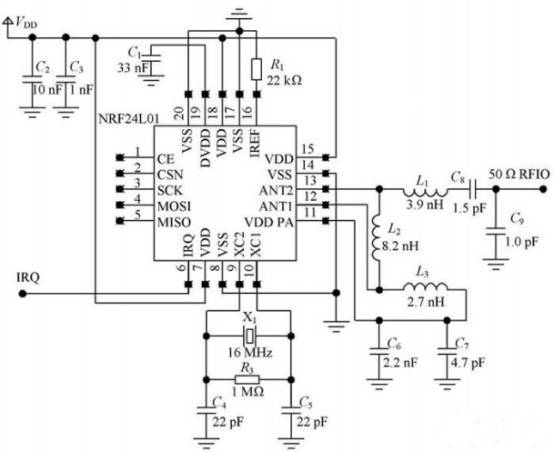 图1 由NRF24L01 芯片构成的通信模块电路图。