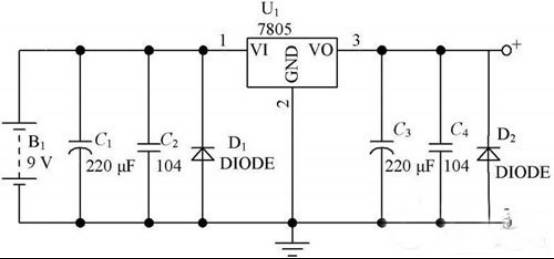 电源电路如图2所示,B1 是9 V 蓄电池或者锂电池, 能够反复充电。C1, C2 , C3 , C4 都是滤波电容, 起到一次与二次滤波作用。D1,D2 是稳压二极管, 使输出端的电压稳定在理想的水平电压。芯片7805 是三端稳压集成电路芯片,具有正电压输出。其电路内部还有过流、过热及调整管等保护电路,最终目的把9 V 电源转变成稳定5 V 输出,为后续设备供电。