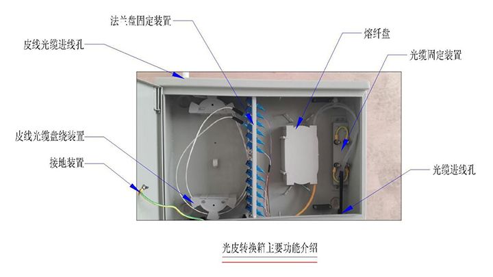 光皮转换箱为小区馈线光缆和入户皮线光缆之间的转接点,是入户皮线光缆的收敛汇聚点,其容量一般为12芯、24芯、36芯和48芯。光皮转换箱内的法兰盘固定装置将小区馈线光缆成端尾纤和预制皮线光缆插接头通过法兰盘插接联通,使馈线光缆纤芯和皮线光缆成为一一对应关系。