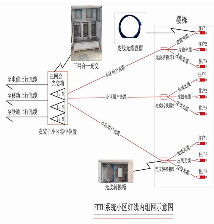 驻地网红线内FTTH组网由三网合一光交箱、小区馈线光缆、光皮转换箱、皮线光缆和相应管网、桥架组成。